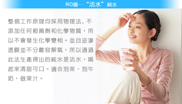 RO膜為0.0001Micron超微小孔徑,以逆滲透原理濾除水中不純物,如:濾過性病毒、 細菌、毒素、化合物、重金屬
